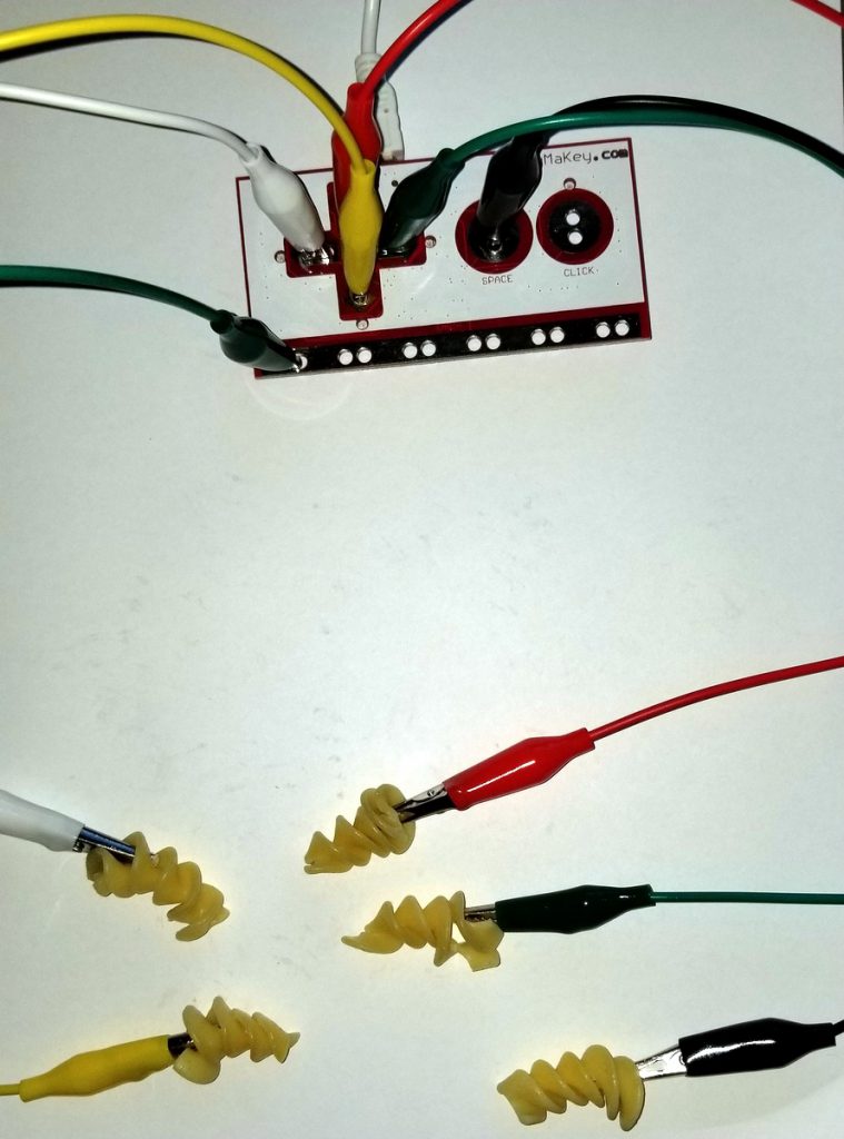 My first attempt at a keyboard was with a few leftover spiral noodles from lunch. I jabbed the alligator clips through the center and tried to play a few games. Unfortunately, this did not work very well. Noodles, as it turns out, are not meant to be repeatedly pressed. They fell apart quickly and I struggled to maintain connection to the Makey Makey. You definitely want to use something that can has a bit more structure and can hold its shape when being poked.