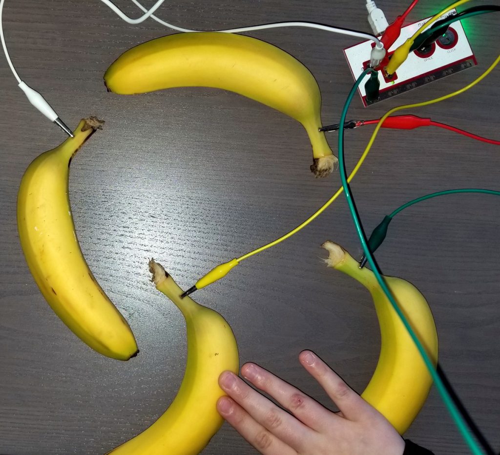 Bananas seem to be one of the most common things people use as keys when starting out on the Makey Makey. This is for a few good reasons: they conduct electricity well, they are firm enough to be used as keys, and playing a game on bananas is just plain fun! It’s hard to overstate how unique the experience is.