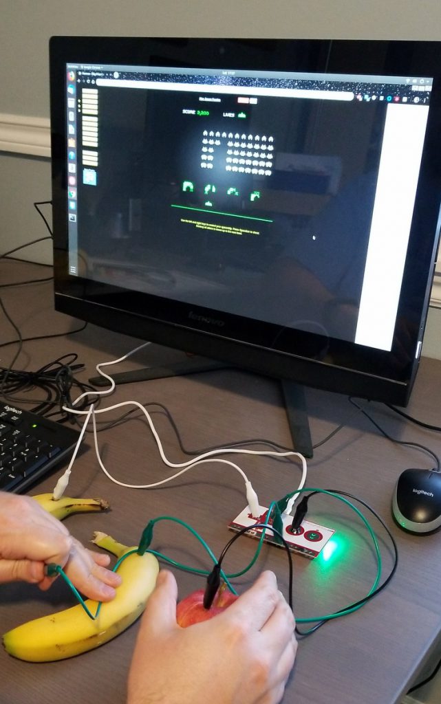 You can see in the picture above that I’m holding the ground wire in my left hand pressing the bananas to move and squeezing the apple to fire. It adds quite a bit of fun to these classic games to mix them up with a creative keyboard.