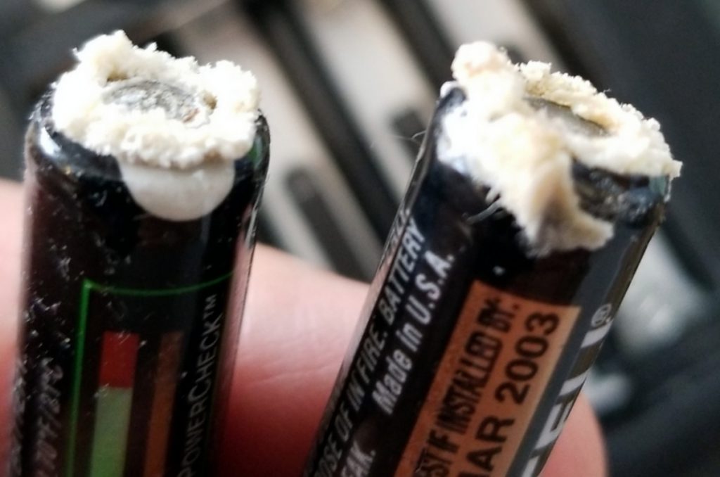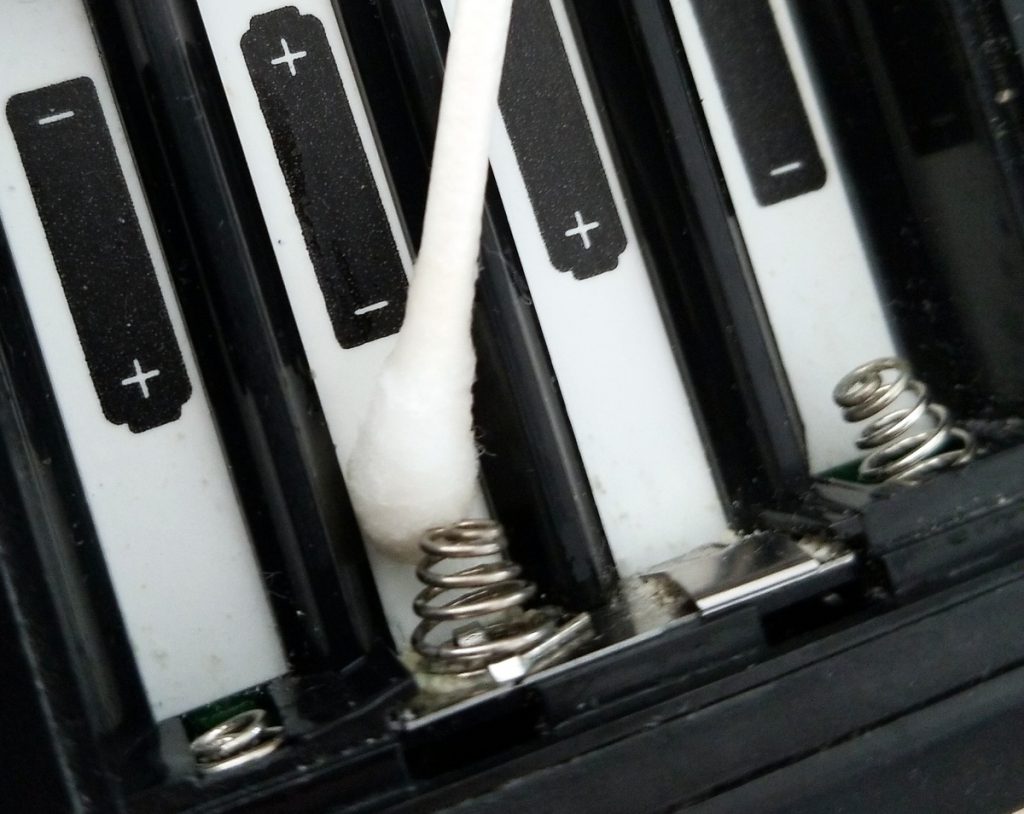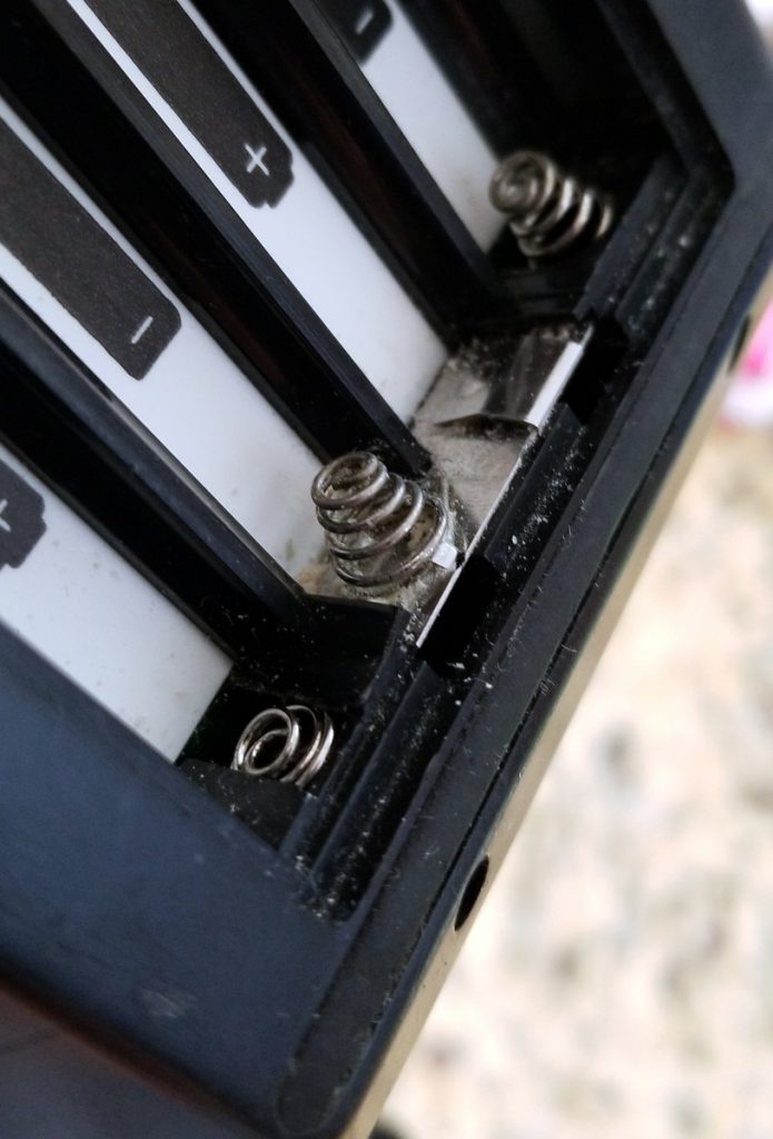 I don’t remember what year those batteries were installed, but they expired 16 years ago. At some point, they leaked their internal potassium hydroxide, which forms a salty crystal called potassium carbonate once outside of the battery. The inside of the battery compartment and several of the springs were caked in the stuff. (This is a skin irritant, a fact I discovered when I picked up the batteries. You should wear gloves when handling leaky batteries.)