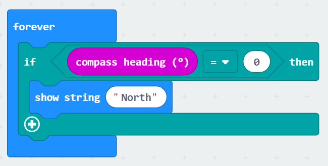 The compass heading block is constantly populated by the compass sensor on the micro:bit. As you physically turn the micro:bit, the value of the block will adjust to the current compass heading value in degrees. This will be an integer between 0° and 359°. (More info about the points of a compass can be found in this Wikipedia article.) Note that in this post, I’ll be discussing degrees and using the degree symbol (i.e. 50°) but it is important to understand that the actual value returned by the sensor will be a number. There is no need to worry about the degree symbol – it is assumed by the program.