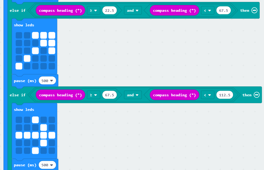 The compass program is fairly simple and uses If, Else If, and Else blocks. (This could be a good project to learn basic programming control flow logic.) We’ll need the following blocks: