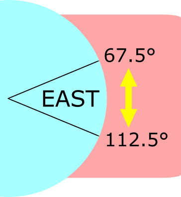 By finding the midpoint between two directions, we can define the edges of the degree ranges on our compass. In this example, East is defined as any degree between 67.5° and 112.5°