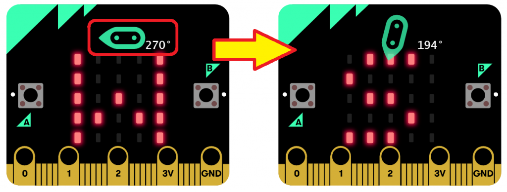 Once you’ve loaded the program onto your micro:bit, you can turn and the arrow will change to indicate the direction you are facing. The compass program works best when the micro:bit is laying flat. (If you hold the micro:bit upright, it will probably not work as expected.)